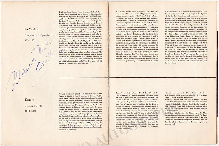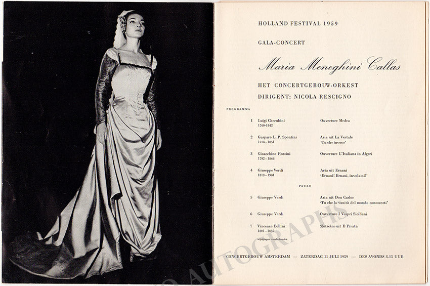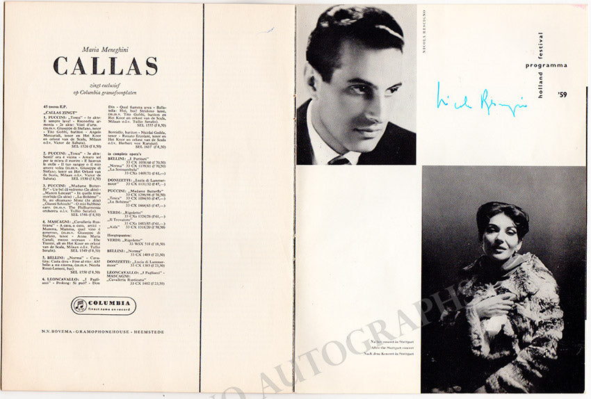 Program for a performance of the star soprano in Amsterdam on July 11th, 1959, with Concertgebouw Orchestra under the baton of Nicola Rescigno, signed by both Callas (on the program notes pages) and Rescigno on his photo page.