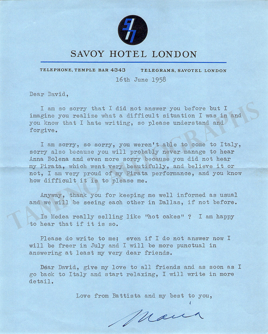 Fine typed letter with the letterhead of the Hotel Savoy London signed by her as simply "Maria" and dated June 16, 1958, addressed to her friend David McElroy, where she comments some comments about her performance in Bellini's opera Il Pirata and Donizetti's Anna Bolena sharing how pleased she was with her work. Size is 6.2 x 7.75 inches, 1 page, folds, in excellent condition.