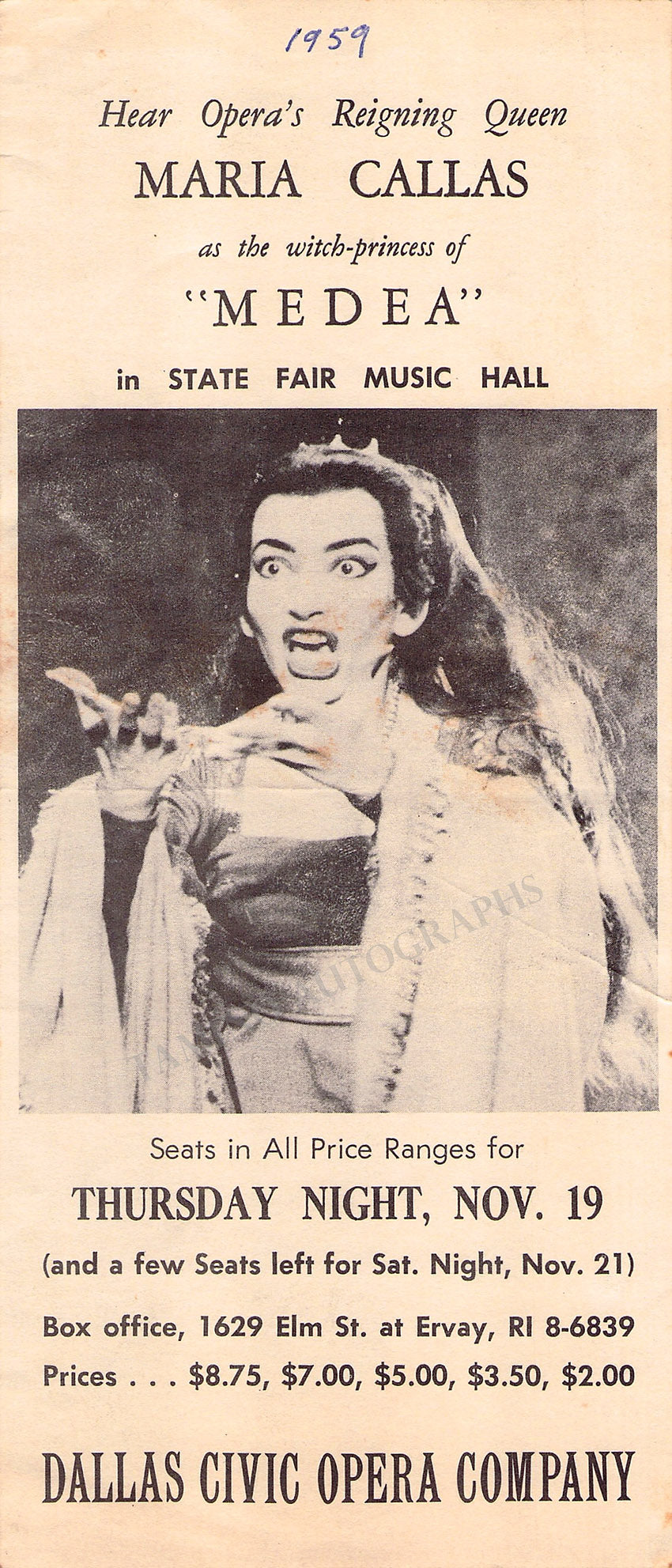 Maria Callas Flyer as Medea Dallas Civic Opera 1959
