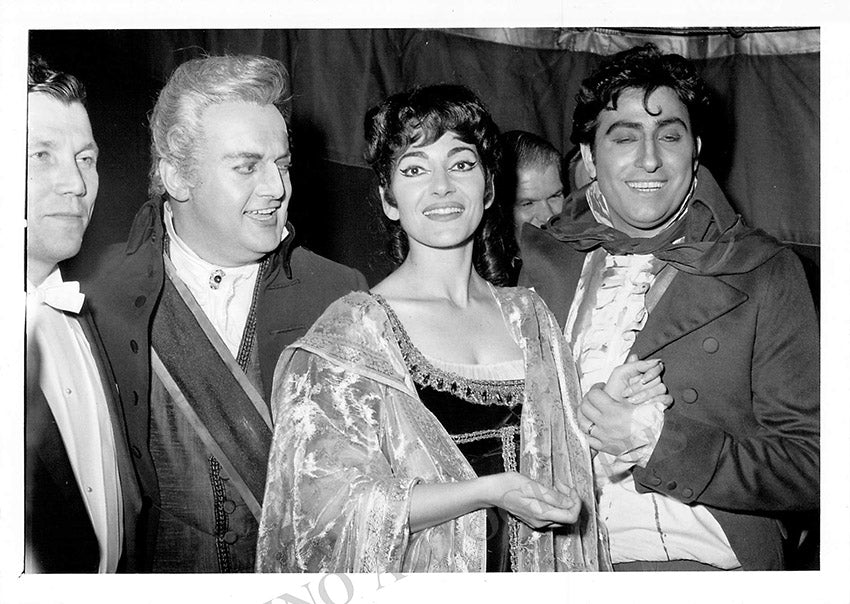 Beautiful collection of 3 unsigned black-and-white photographs taken backstage after the performance of Puccini's opera Tosca starring Maria Callas, Tito Gobbi, Renato Cioni, and Georges Pretre.