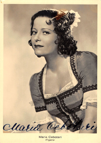 Signed postcard photograph, shown as Susanna in Mozart's Nozze di Figaro. Bold handwriting and signature. Printed photographer signature on bottom left. Size is 4 x 5.75 inches, in excellent condition.