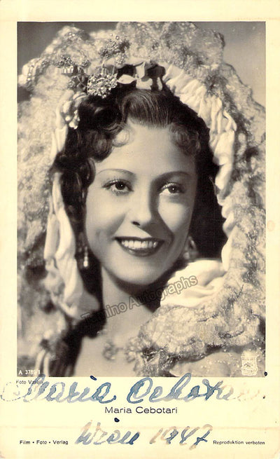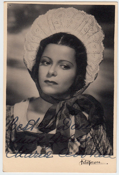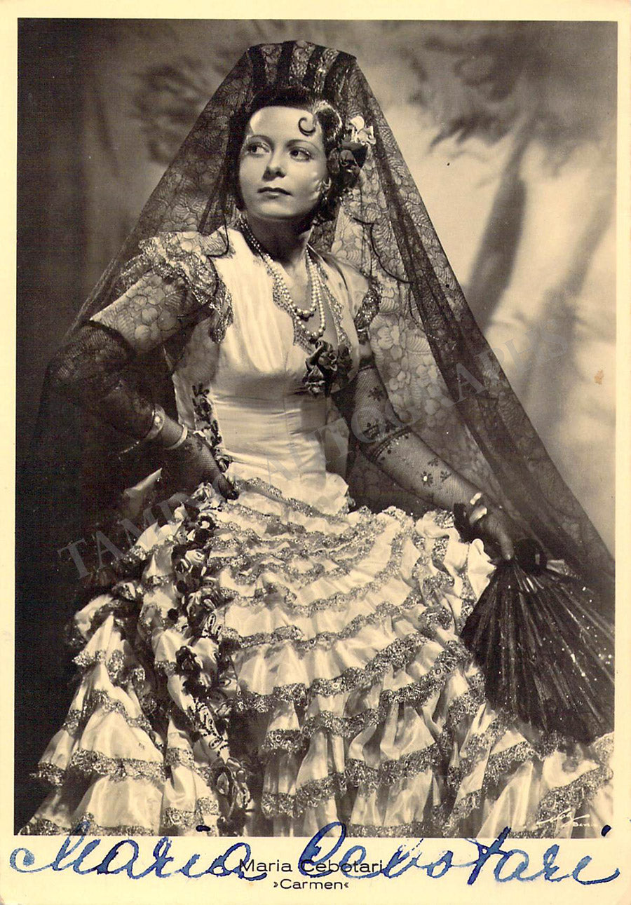 Gorgeous black-and-white photo postcard signed by hers, shown as Carmen in Bizet's opera. Size is 4 x 5.75 inches, in excellent condition.