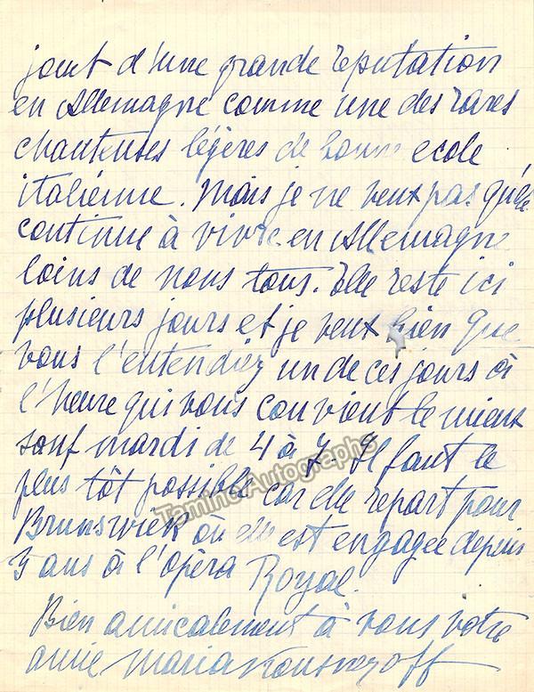 Ukrainian soprano (1880-1966), autograph letter signed in Paris, undated, written in french, sold untranslated. Size is 8.25 x 10.5 inches. The letter has a small hole, otherwise is in very good condition.