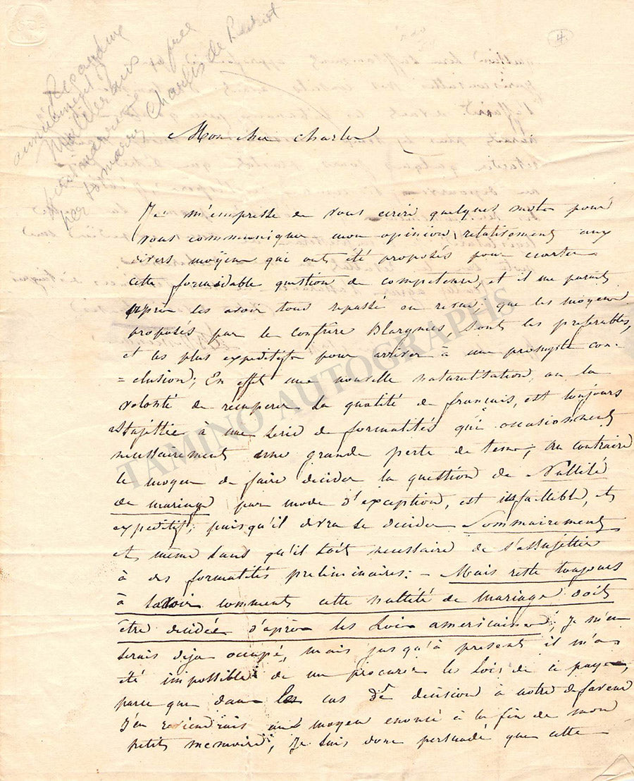 3. Chessman, L. B. Autograph letter dated 1824 addressed to De Beriot (Malibran's husband) about Maria's annulment of previous marriage, freeing her to marry De Beriot.