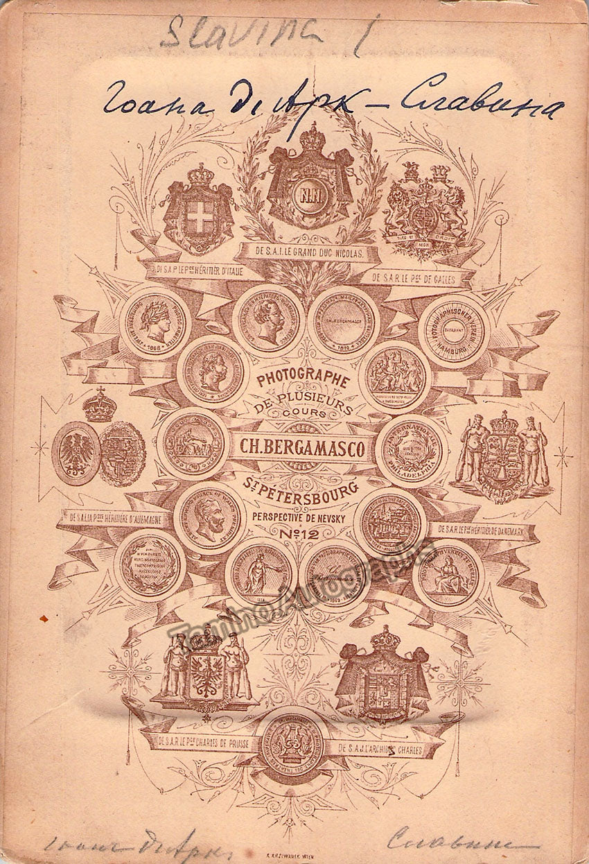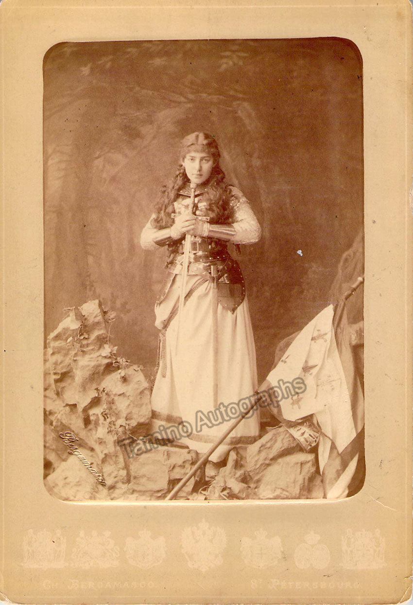 Gorgeous original cabinet photograph of the singer by Bergamasco (St. Petersbourg), shown as Giovanna d'Arco in Verdi's opera, blind-stamped by the photographer.  Size is 4.5 x 6.6 inches, in excellent condition.