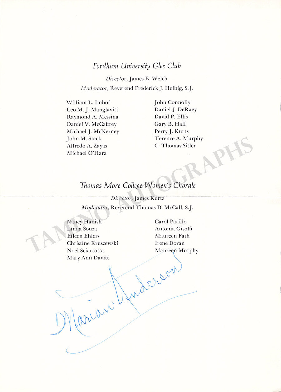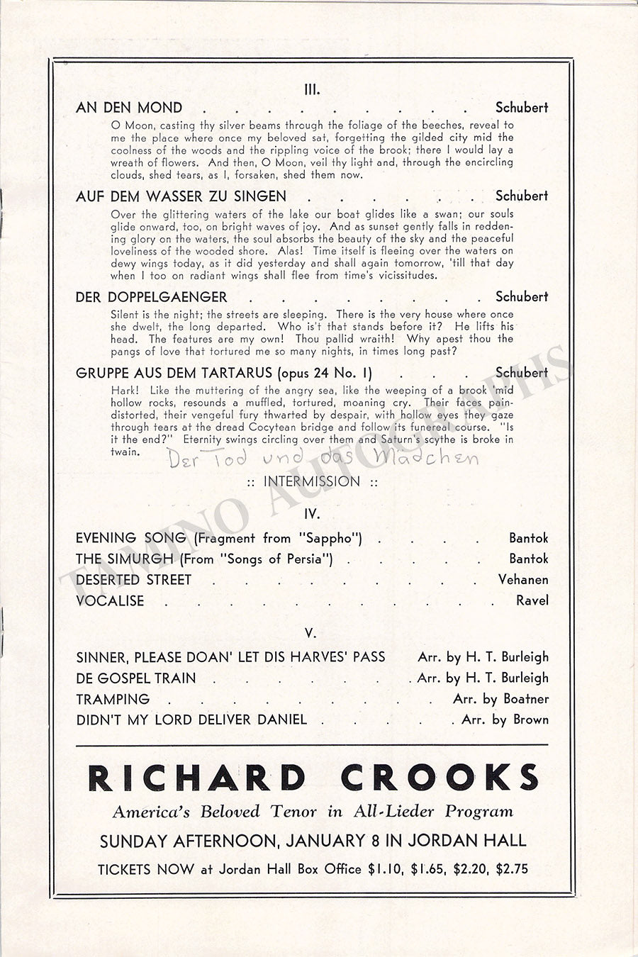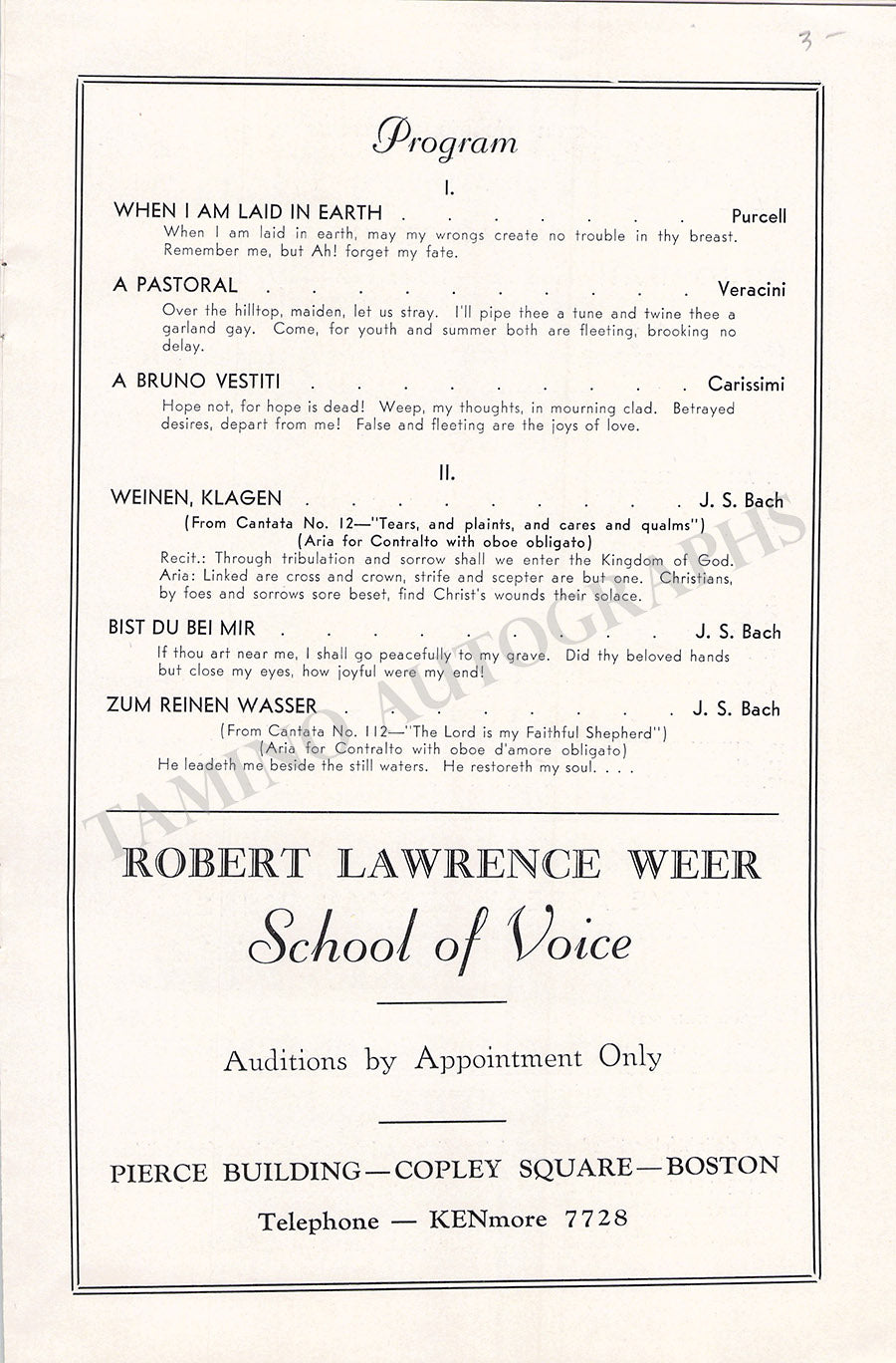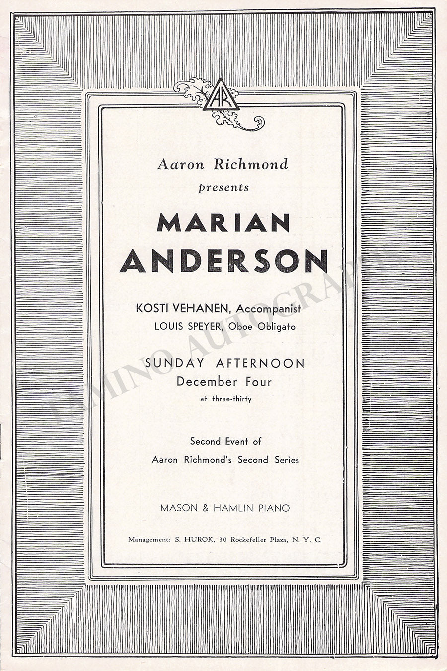 Program for a performance of the American contralto with an accompanist in New York, (no year indicated).  Size is 6.1 x 9.1 inches, full program with all pages and covers, in excellent condition.