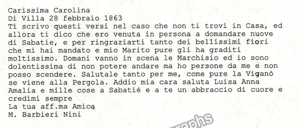 Marianna Barbieri-Nini Autograph Letter Signed 1863