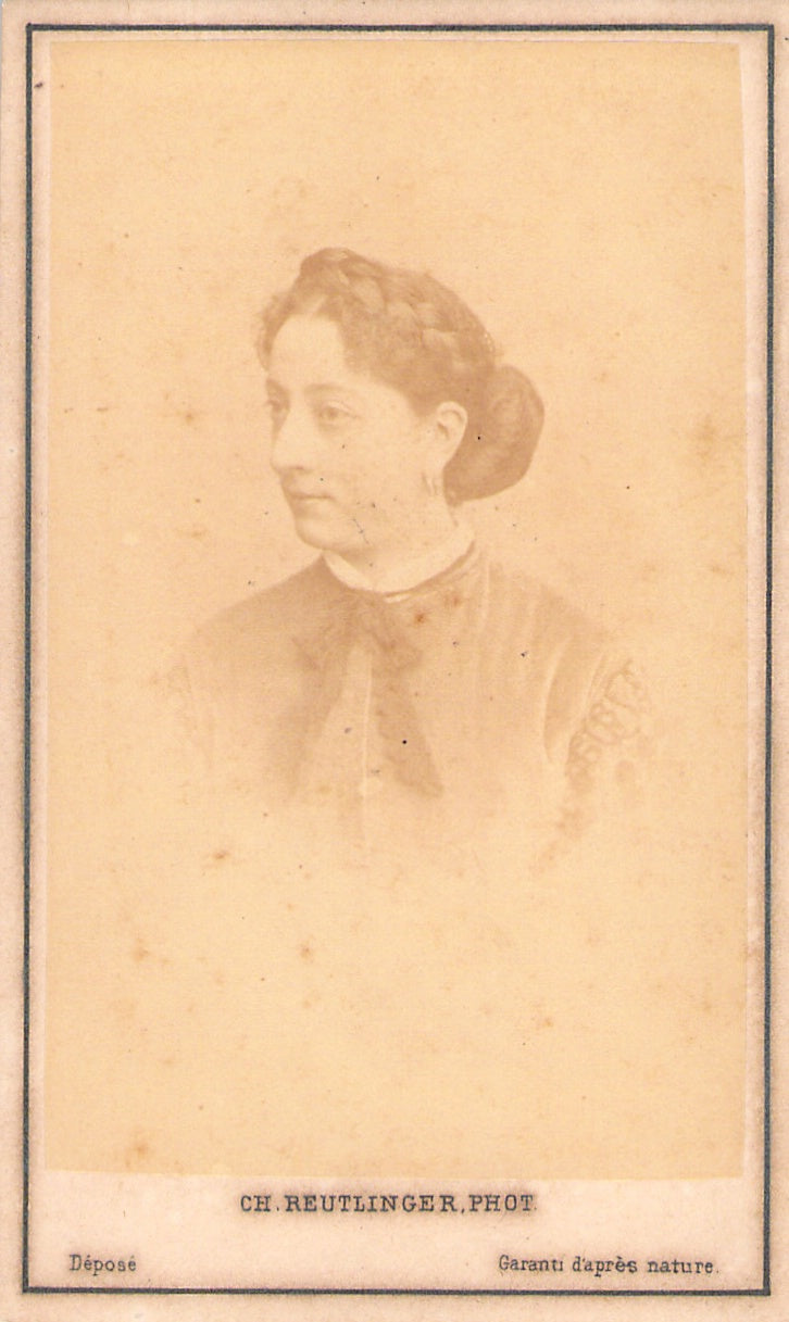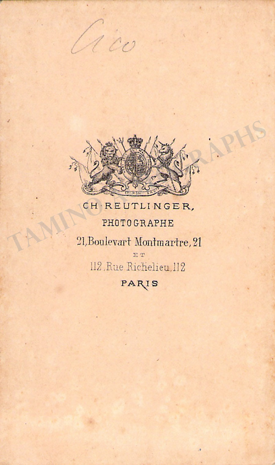 Fine vintage (unsigned) Carte-de-Visite CDV photo of her by photographer Charles Reutlinger (Paris). Size is 2.4 x 4.1 inches, som rust stains, in overall excellent condition.