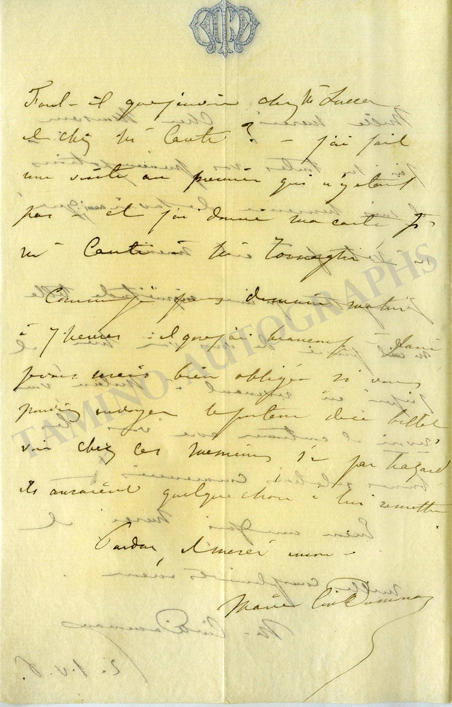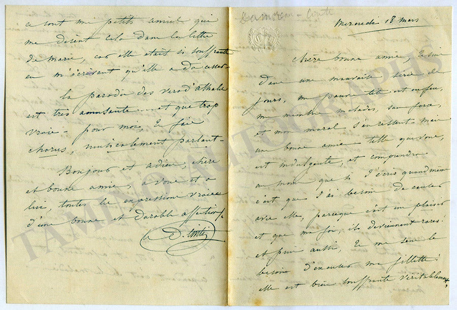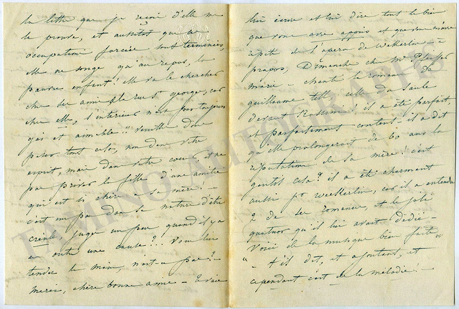 Set of two autograph letters in French (untranslated) signed by her, one of them dated 1871. The letters concern publishing matters, personal issues around a Creole girl, and singing performances.