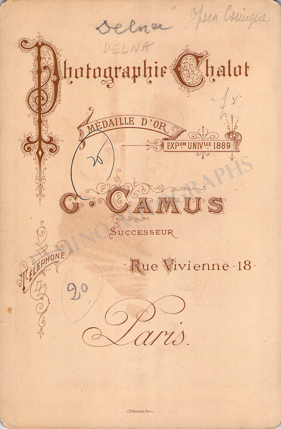 Unsigned cabinet photograph, by G. Camus of the Chalot photography studio, Paris. Shown most likely in role. Size is 4.25 x 6.5 inches, in excellent condition.