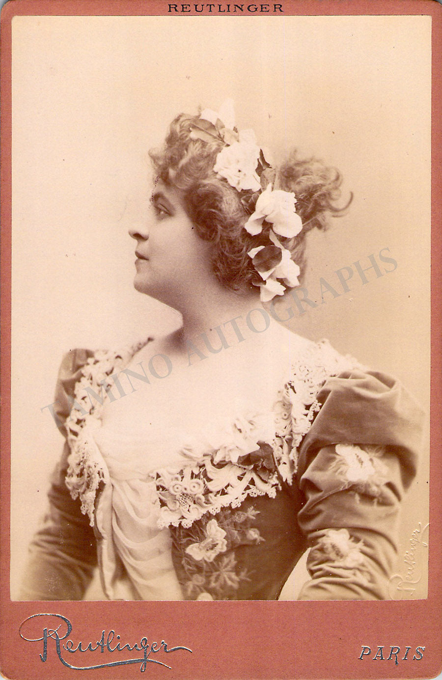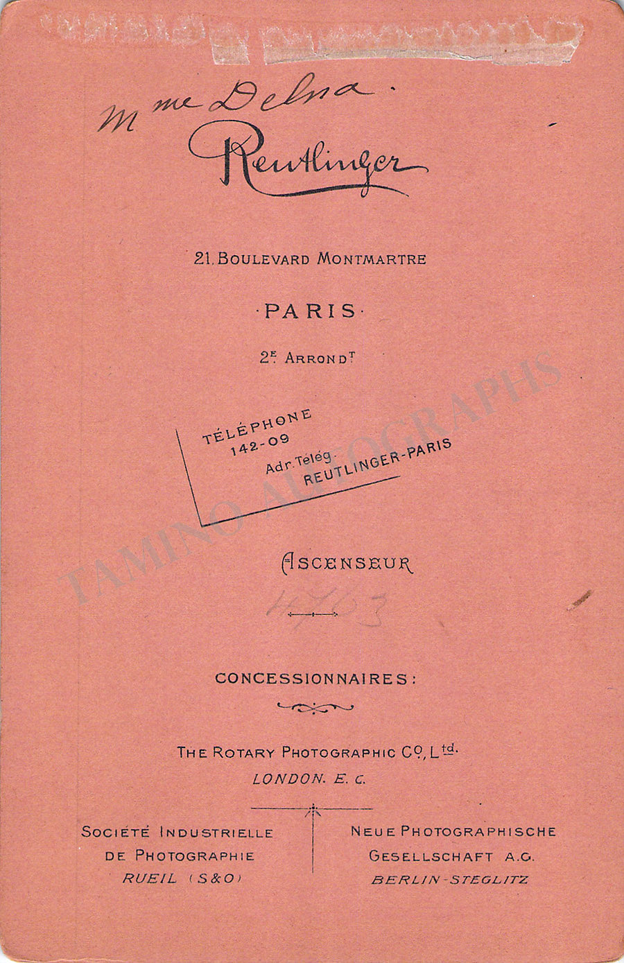 Unsigned cabinet photograph, shown in role. Photo is by Reutlinger, Paris, whose name is stamped on the front and also has a printed signature on verso. Size is 4.25 x 6.5 inches, in excellent condition.