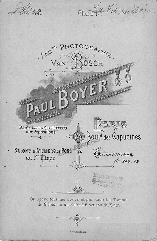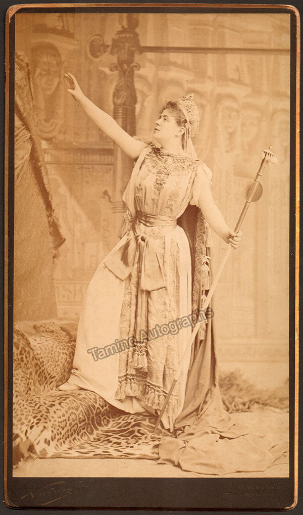 Unsigned cabinet photo, by Paul Boyer, Paris. Shown in the world premiere of La Vivandiere (opera by Benjamin Godard). Size is 4.25 x 6.5 inches, in excellent condition.