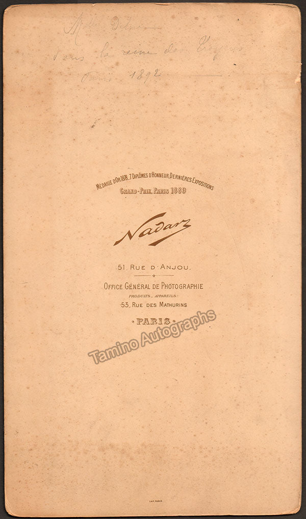 Beautiful vintage, unsigned, cabinet photo by Nadar (Paris), 1892, featuring Delna as Didon in Berlioz' opera Les Troyens. Size is 7.6 x 13.1 inches, some damage in all four corners, otherwise in good condition.