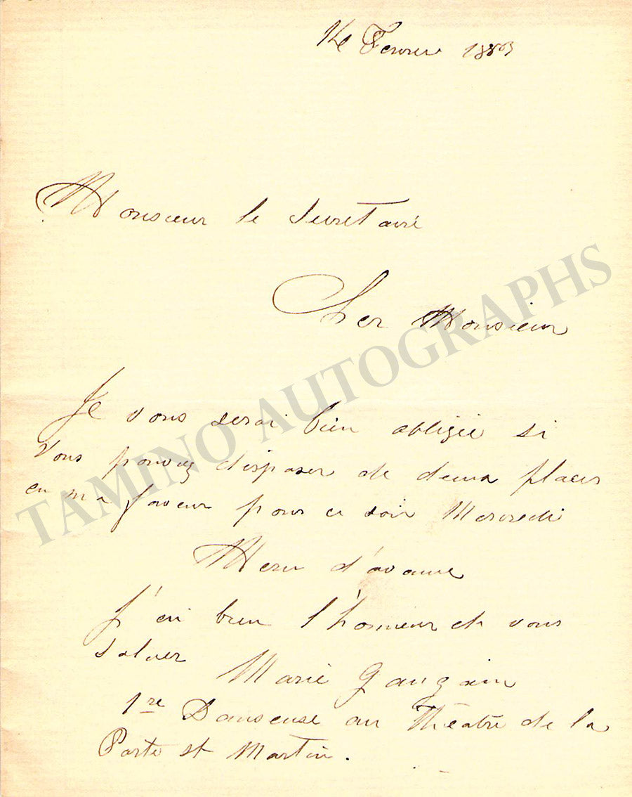 Autograph letter in French signed by her, dated February 14, 1867, addressing a secretary: "... I shall be much obliged to you if you can get two seats in my favour for this evening". Size is 4 x 5 inches, 1 page, in very good condition.