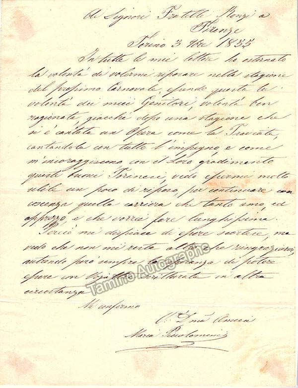 Autograph letter signed, dated in Florence in 1855. Written in Italian, sold untranslated. One page, sized 7.75 x 10 inches, with minor rust spots, otherwise, in very good condition.