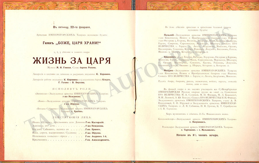Program for a performance of Glinka's opera "A Life for the Tsar" on February 22, 1913, at the Mariinsky Theater in San Petersburg, Russia, celebrating the 300th anniversary of the theater (1613-1913). Guest stars included Nezhdanova, Sbruyeva, Yershov, and Kastursky.