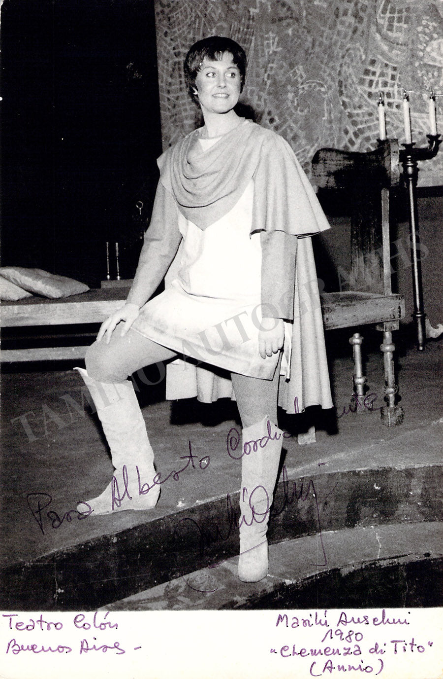 Fine black-and-white photograph signed by her, shown as Annio in Mozart's opera La Clemenza de Tito, a Teatro Colon production from 1980. Size is 4.6 x 7 inches, in excellent condition.