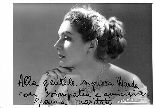 Italian soprano (1930-1971), signed photo, shown as herself. Stamped on verso by photographer A. Villani, Bologna. Size is 4 x 5.75 inches, in excellent condition.