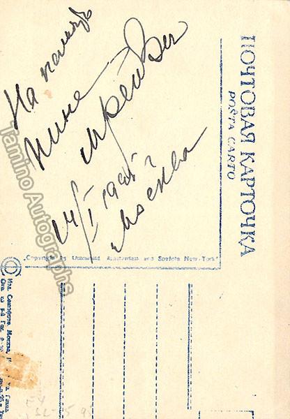 Russian bass 1895-1992), one of the greatest from the Soviet era. Nice photo postcard signed by him on verso, a very rare autograph. Size is 3.5 x 5 inches, trimmed at the bottom not affecting the autograph, minor crack near the bottom right corner. Very rare!