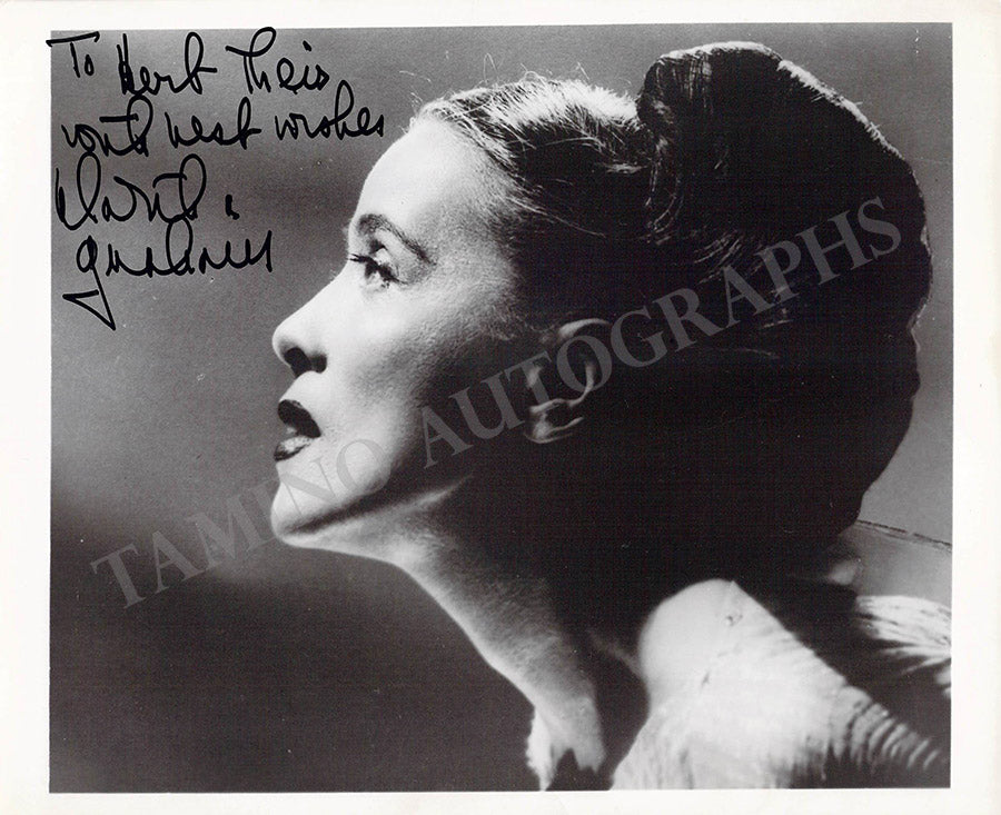 Fine black-and-white photograph signed and inscribed by her with a short sentiment; ink-stamped on verso by agent Sol Jurok. Size is 10 x 8.1 inches, in excellent condition.