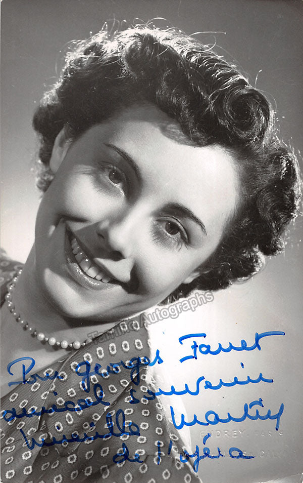 French soprano, signed photograph, shown as herself, inscribed. Blind stamped on front by photographer Endrey, Paris. Size is 3.5 x 5.5 inches, small creases and paper loss on edges, otherwise in very good condition.