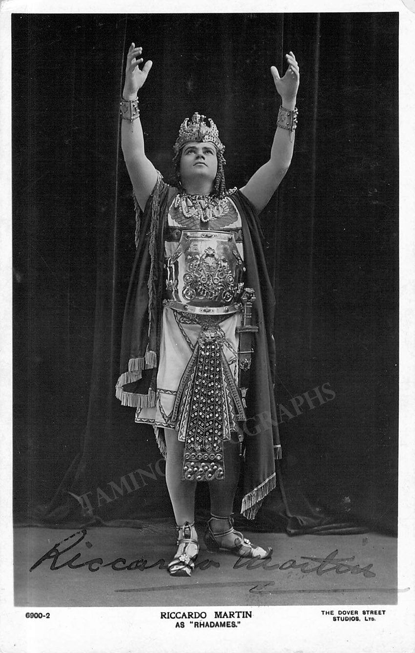 Gorgeous black-and-white photo postcard signed by him, shown as Radames in Verdi's opera "Aida". Size is 3.5 x 5.5 inches, in excellent condition.