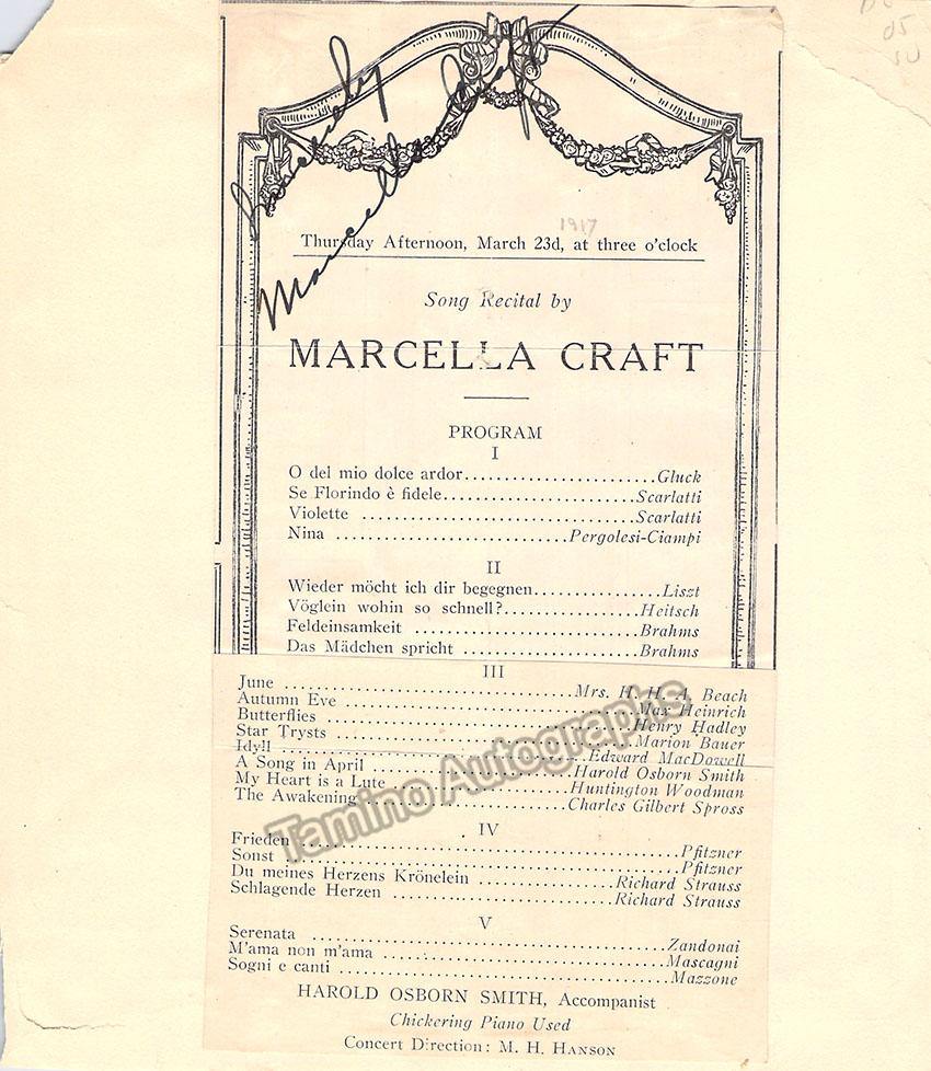 Clip from a Metropolitan Opera program on an album page for a performance of Giordano's Madame Sans-Gene on March 2nd, 1917, signed by the Italian tenor and the American soprano.  On the verso there is another clip signed by the American soprano Marcella Craft, dated March 23rd, 1917.  Total size is 6.4 x 7.4 inches, in very good condition.
