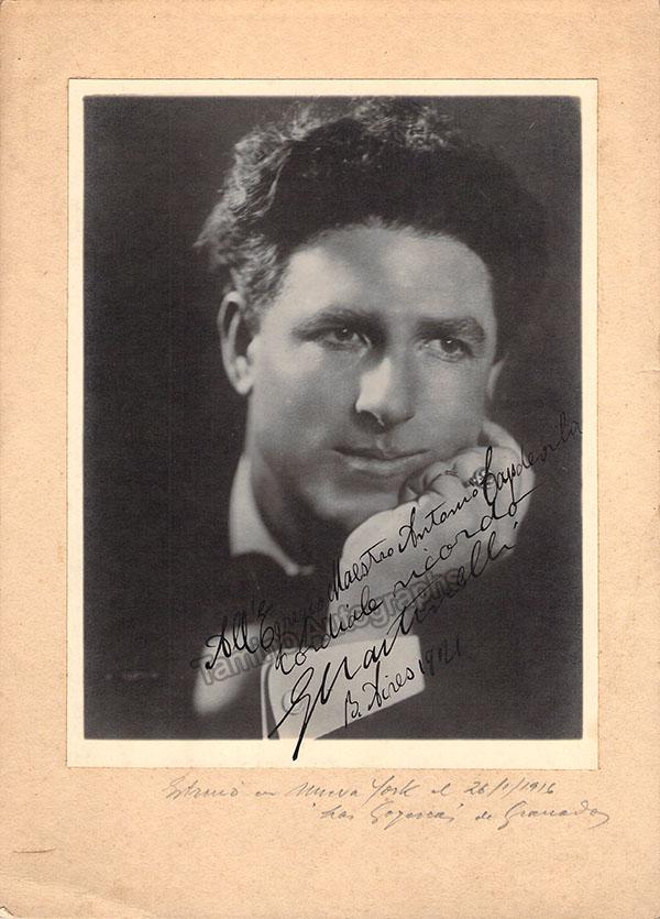 Italian tenor (1885-1969), who had a long and very successful career at the Metropolitan Opera in New York, also appearing in many other major international opera theaters. Attractive large photo, shown as himself, signed in Buenos Aires, dated in 1921. Inscribed. Photo itself is sized at 6.75 x 8.3 inches attached to larger mat, total item size is 8.25 x 11.5 inches. Beautifully preserved in excellent condition.
