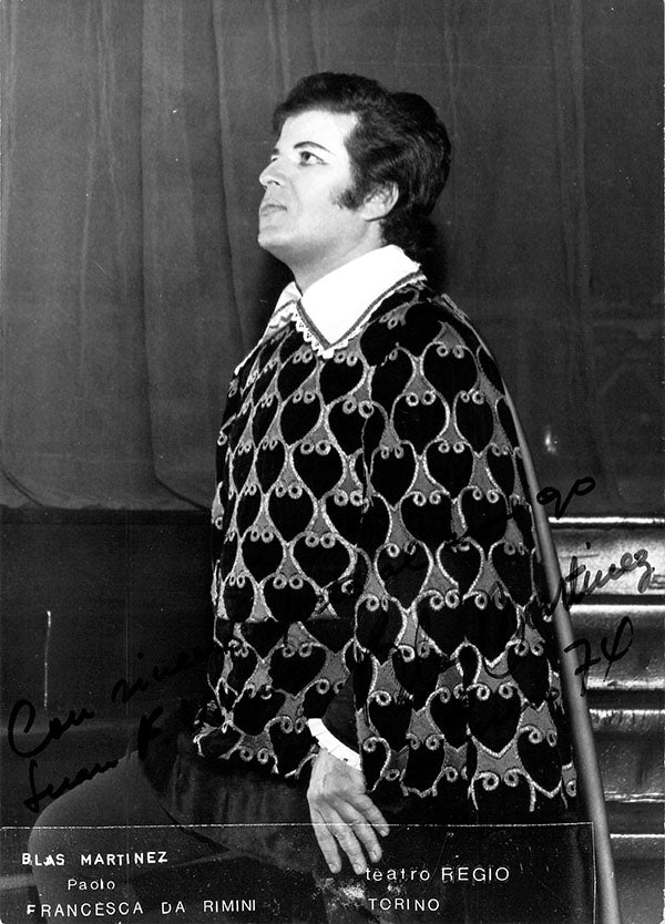 Spanish tenor, signed photograph, shown as Paolo in Zandonai's Francesca Da Rimini at Teatro Regio, Turin, inscribed in Turin, dated in 1974. Size is 5 x 7 inches, in excellent condition.