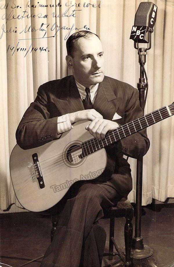 Uruguayan guitarist and composer (1901-1973), signed photo, shown with the instrument, inscribed and dated in 1942. Stamped on verso by the NBC. Size is 6.25 x 9 inches, in very good condition.