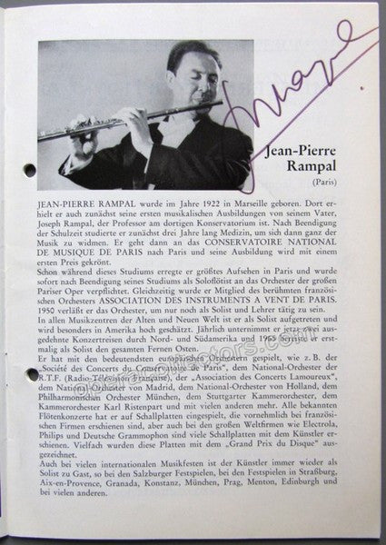 Orchestre National de la Radiodiffusion Television Francaise, 29.04.1969 Nurnberg Cond.: Jean Martinon, Soloist : Jean-Pierre Rampal, Flute. Jean Martinon : Ouverture pour une tragedie grecque, Mozart : Konzert fur Flote no.1, Berlioz: Symphonie fantastique, op. 14, 20 pages, 6 x 8 inches. Signed by both Rampal and Martinon