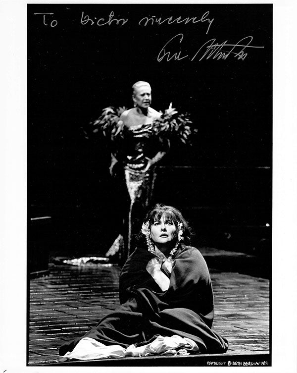 Signed photograph, shown in role (possibly Richard Strauss's Salome), inscribed. Stamped on verso by photographer Beth Bergman, New York. Size is 8 x 10 inches, in excellent condition.