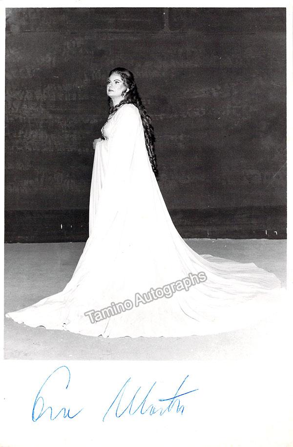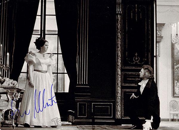 Fine color photograph signed by her, shown during a performance of Strauss' opera Die Frau Ohne Schatten. Size is 4 x 5.75 inches, printed sticker on verso, ink-stamped on verso by Photo Schaffler (Salzburg), in excellent condition.