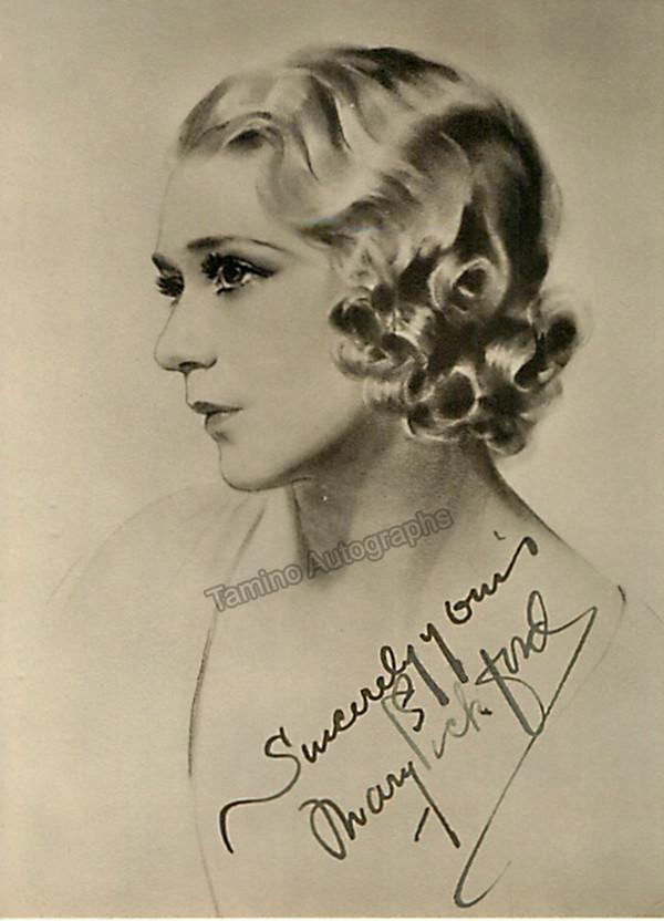 Canadian-American actress (1892-1979), co-founder of the studio United Artists and one of the original founders of the Academy of Motion Pictures and Sciences. Pickford was active between 1905 and 1949, participated in tens of film - many of them silent. Signed photo, 3.5 x 4.5 inches, excellent condition