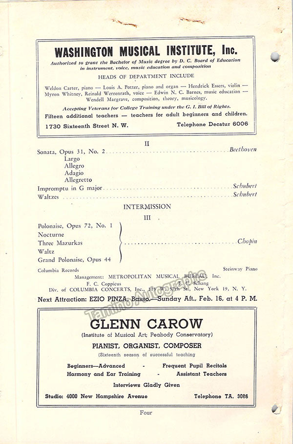 Program for a recital of the Polish pianist at the Constitution Hall, Washington, on February 2nd, 1947, performing works by Handel, Bach, Mozart, Chopin, and Schubert, signed by her on page 2.