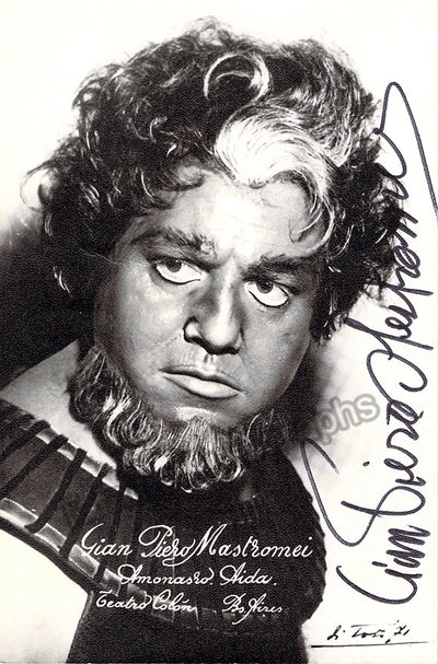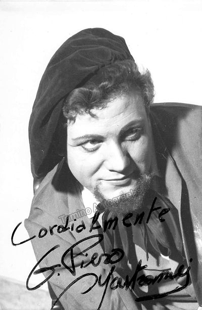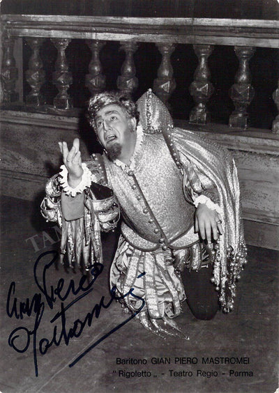 Signed photograph, shown in the title role of Verdi's Rigoletto. Stamped on verso by photographer Montacchini, Teatro Regio, Parma. Size is 4 x 5.75 inches, slight paper loss at far corners, otherwise in excellent condition.