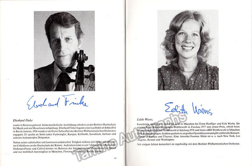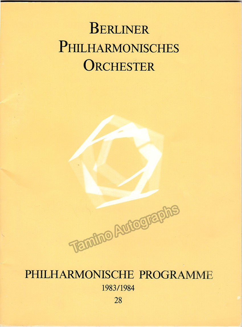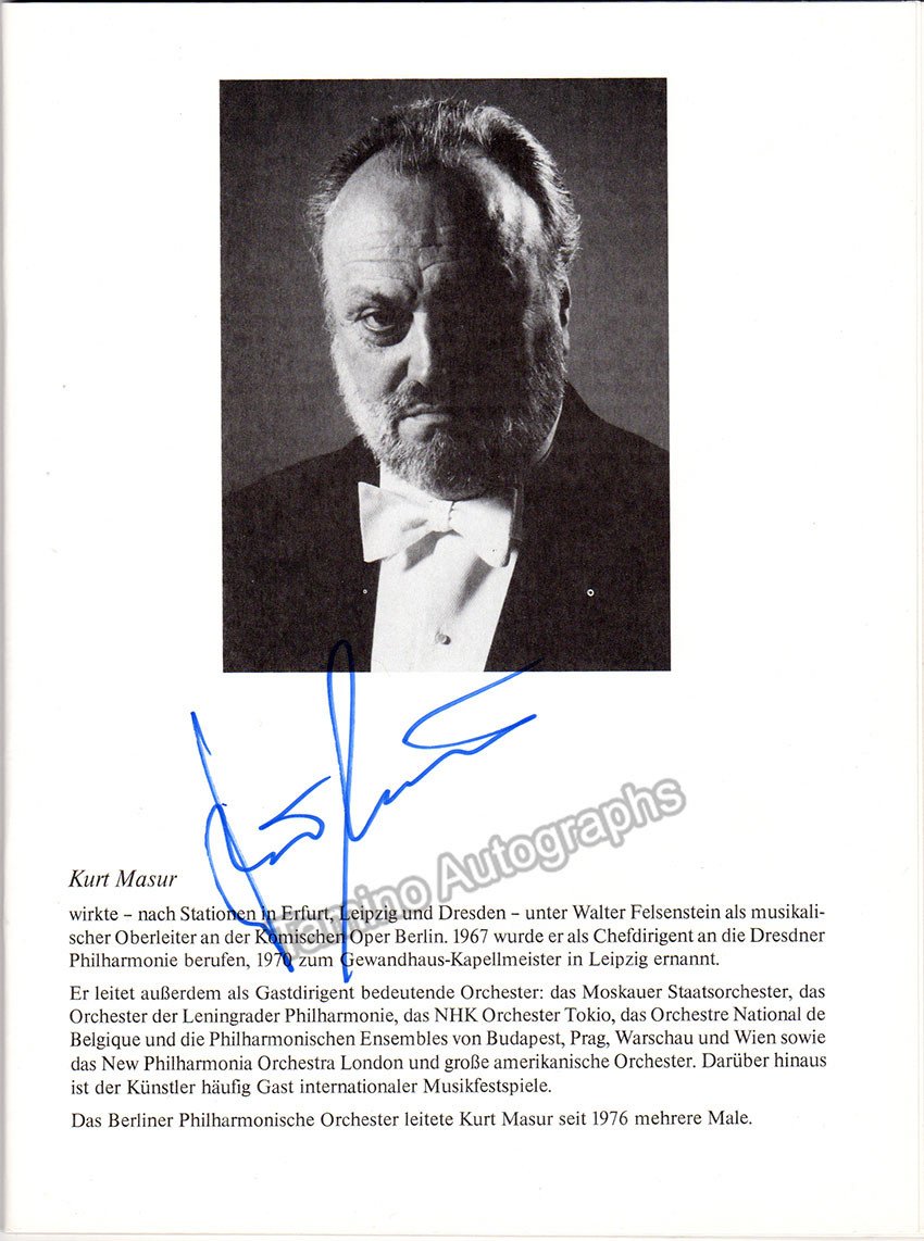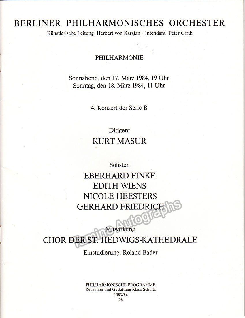 Berlin Philharmonic program for a concert in 1984, signed on the photo pages by conductor Kurt Masur and soloists Eberhard Finke, Edith Wiens, Nicole Heesters and Gerhard Friedrich. Size is 7 x 8.75 inches, complete and in excellent condition. Includes newspaper article about the performance.