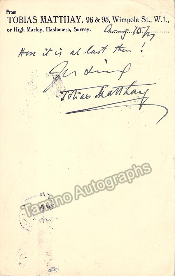 English pianist, teacher and composer (1858-1945), Matthay opened his own piano school and published and important book on piano pedagogy. Signed postcard, dated by him on August 10th (stamp by the post office on verso states 1927), size is 3.5 x 5.5 inches