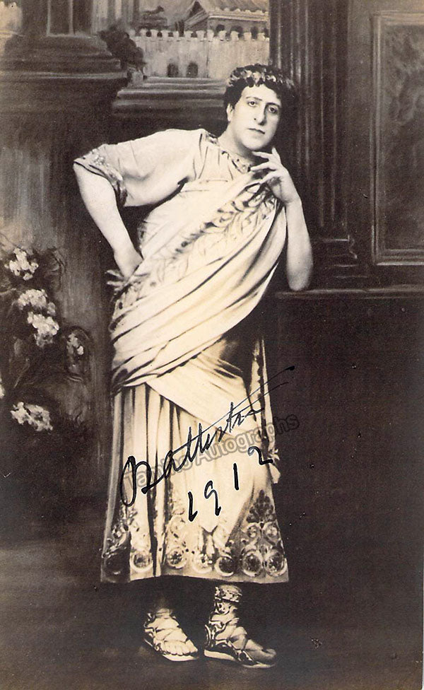 Fine black-and-white original cabinet photograph of the baritone in role by photographer Lorens (St. Petersburg) signed and inscribed by Battistini with a short sentiment dated 1894, shown in role. Size is 4.2 x 6.3 inches, some damage over the borders, otherwise in excellent condition.