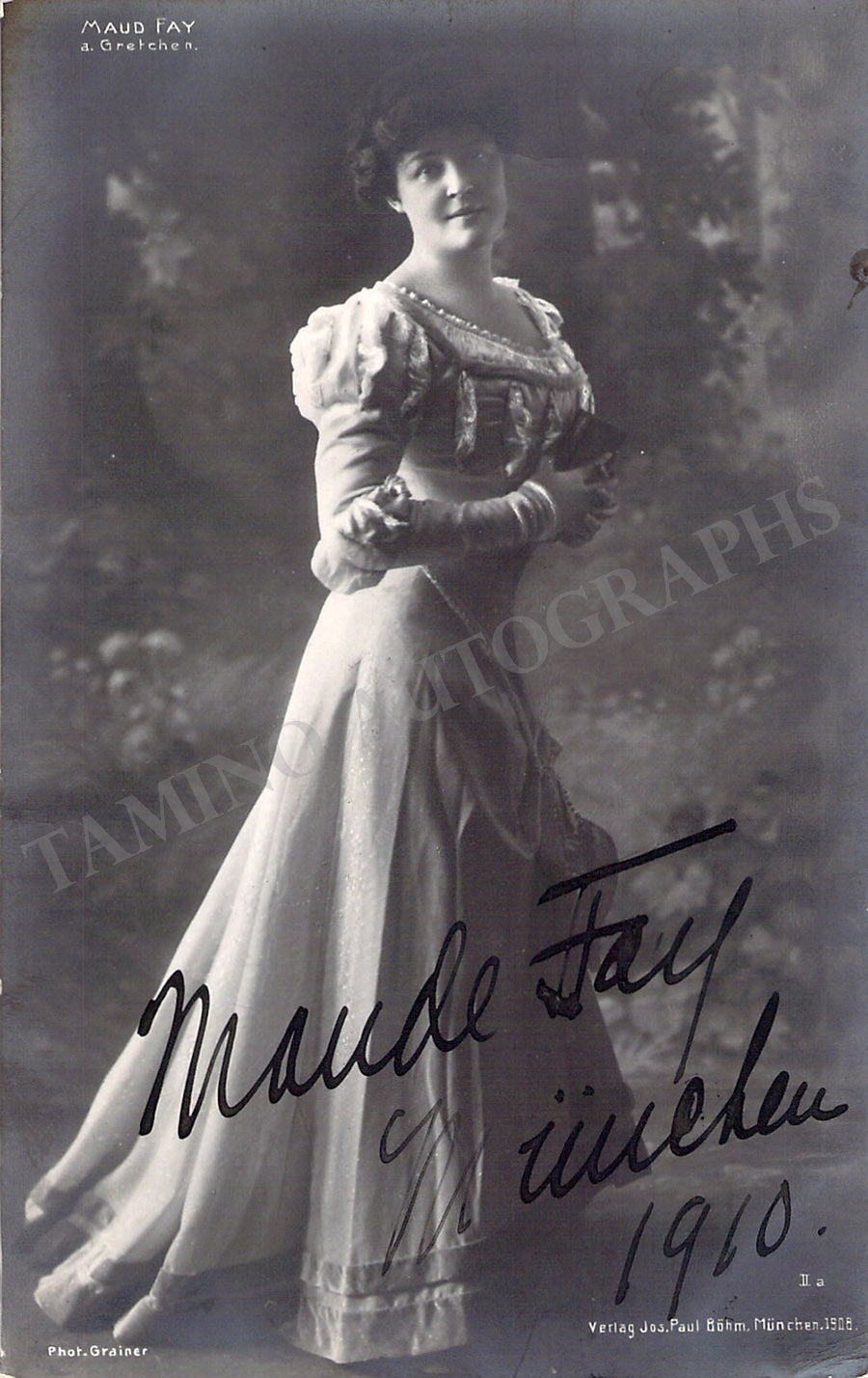 Gorgeous black-and-white photograph signed by her in 1910, shown as Gretchen (Marguerite) in Gounod's opera Faust. Size is 3.5 x 5.3 inches, some silvering around the borders, in very good condition.