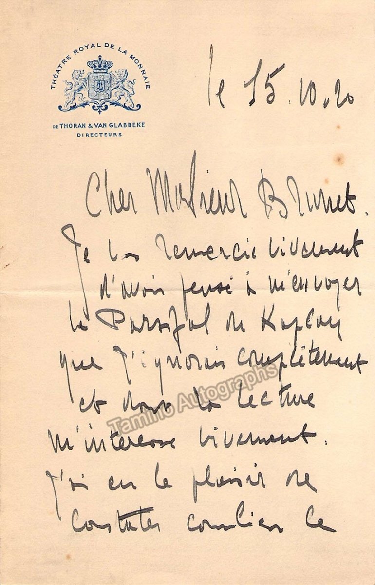 Belgian musician and conductor (1881-1953), worked as a conductor and Director of Theatre Royale de la Monnaie in Brussels for many years. Autograph note signed, with the letterhead of the theater, dated in 1920. Two pages, 4.5 x 7 inches, in French, sold untranslated, in excellent condition.