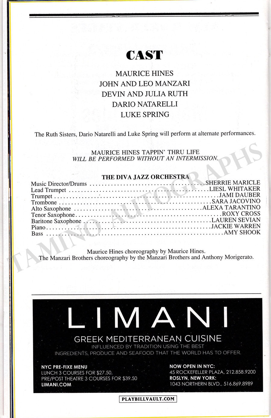 Original playbill for a performance of the show Maurice Hines Tappin' Thru Life at New World Stages, starring Maurice Hines, John and Leo Manzari, Devin and Julia Ruth, Dario Natarelli, and Luke Spring; signed by Hines.  Size is 5.3 x 8.5 inches, in excellent condition.