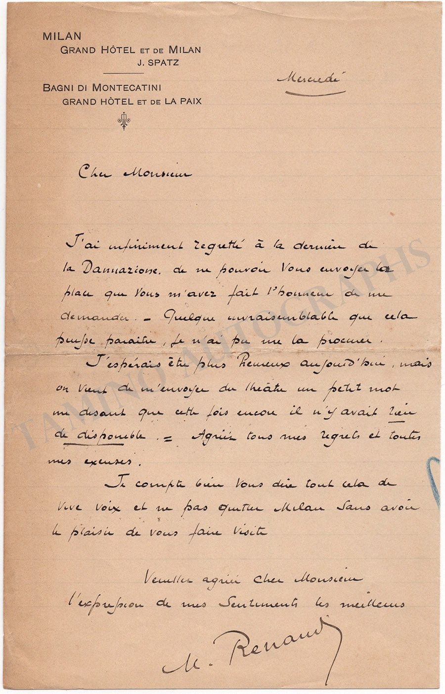 Autograph letter in French (untranslated) signed by him, no date [1903], addressed to a gentleman, regretting not being able to find theater seats for the previous evening performance of Berlioz’s La Damnation de Faust.