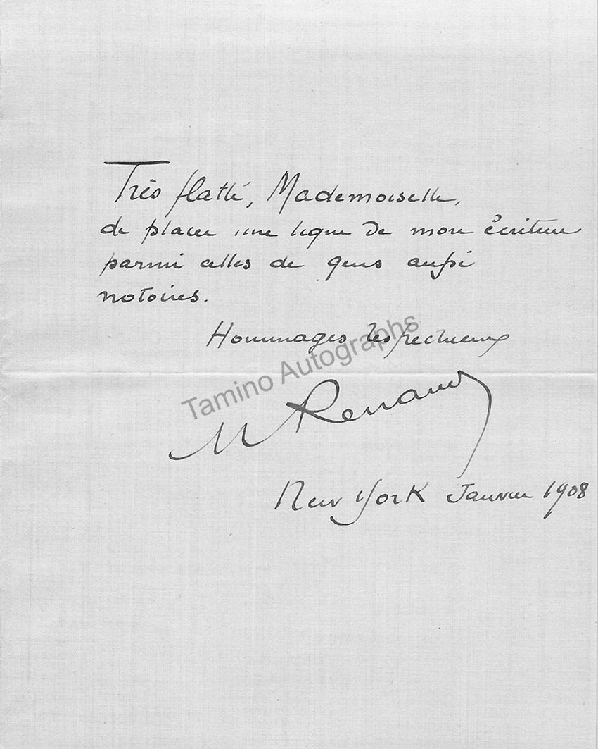 Autograph note signed, dated in Paris in 1900, 1 page written in French, sold untranslated. Bold handwriting and signature. Size is 6 x 8 inches, in excellent condition.