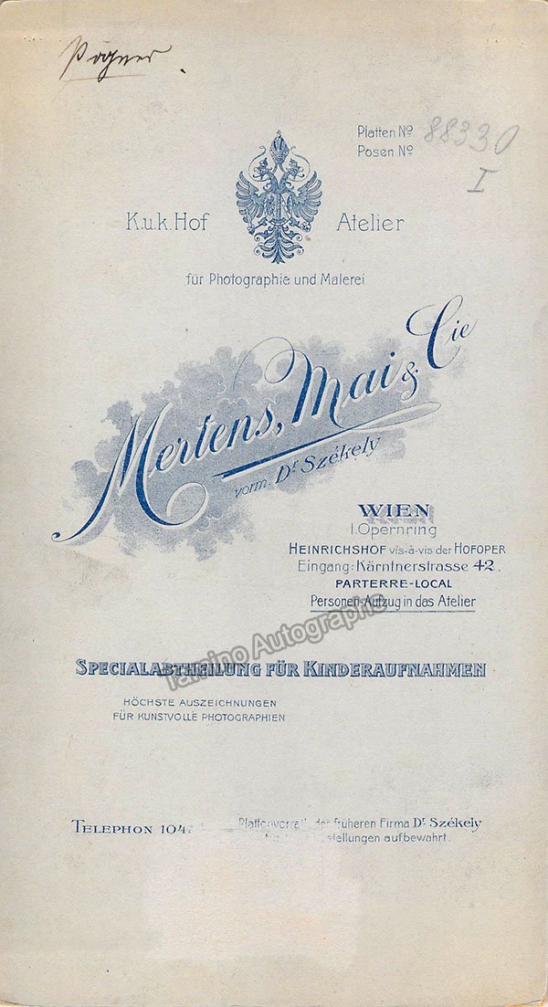Signed cabinet photo, shown as Pogner in Wagner's Die Meistersinger, dated in 1905. Photo by Mertens, Mai, and Cie, Vienna. Size is 4.5 x 8 inches, very slight paper loss at top left, otherwise very attractive vintage item in excellent condition.