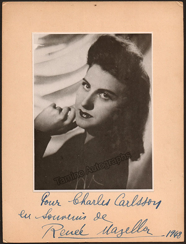 French soprano (1913-?), signed photograph, shown as herself, dated in 1948. Inscribed.  Photo size is 4.75 x 6.5 inches, mounted on soft cardboard, total item is 7.5 x 10 inches, some creases on cardboard, otherwise in excellent condition.