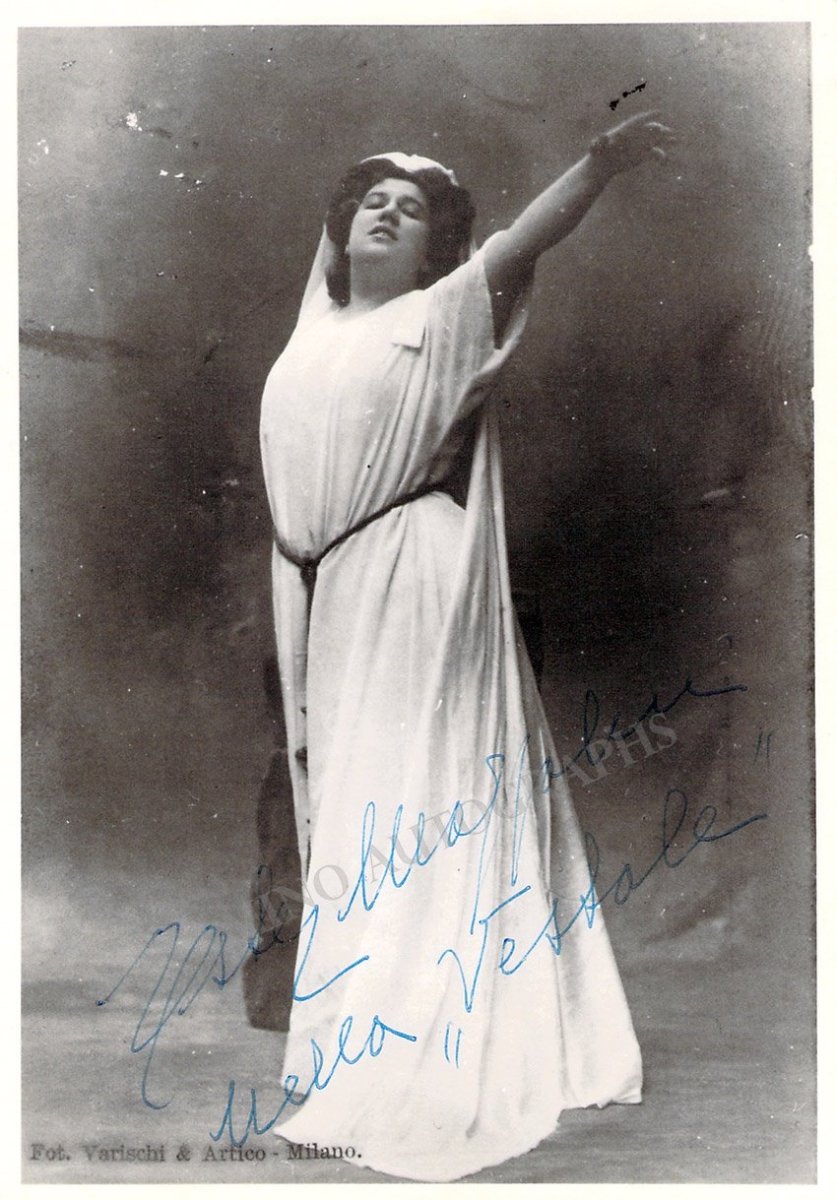 Croatian-born Italian soprano (1883-1982), signed photo, shown in Gaspare Spontini's La Vestale. Blind stamped by photographers Varischi and Artico, Milan. Size is 4 x 5.75 inches, some silvering at top not affecting the image or signature. Otherwise in good condition.