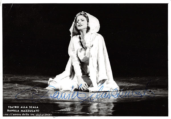Signed photo, shown in Mozart's La Finta Giardiniera at La Scala. Stamped on verso by photographer Erio Piccagliani. Size is 4.25 x 5.75 inches, in excellent condition.