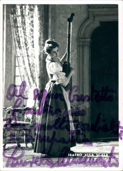 Signed photograph, shown as Susanna in Mozart's Le Nozze di Figaro at La Scala, inscribed. Stamped on verso by photographer Erio Piccagliani. Size is 4.25 x 5.75 inches, small creases on edges, otherwise in excellent condition