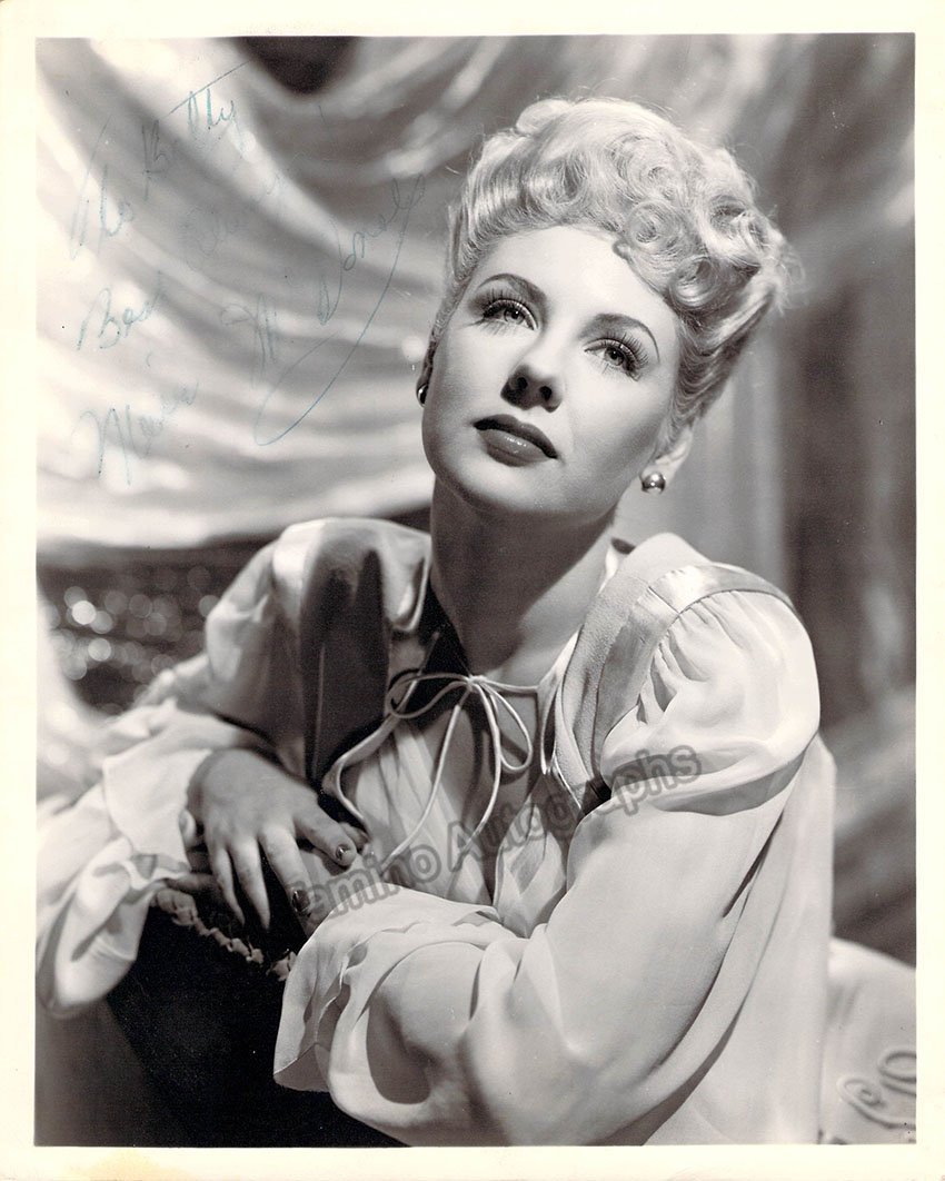 American singer and actress (1923-1965), known as "The Body Beautiful" and later nicknamed "The Body". Signed black and white photo shown in a movie, inscribed. Signature is on the light side but still visible. Size is 8 x 9.9 inches, in very good condition.